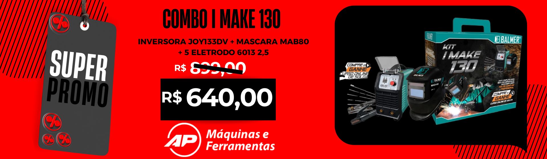 combo i make 130 - inversora joy133dv + mascara mab80 + 5 eletrodo 6013 2,5